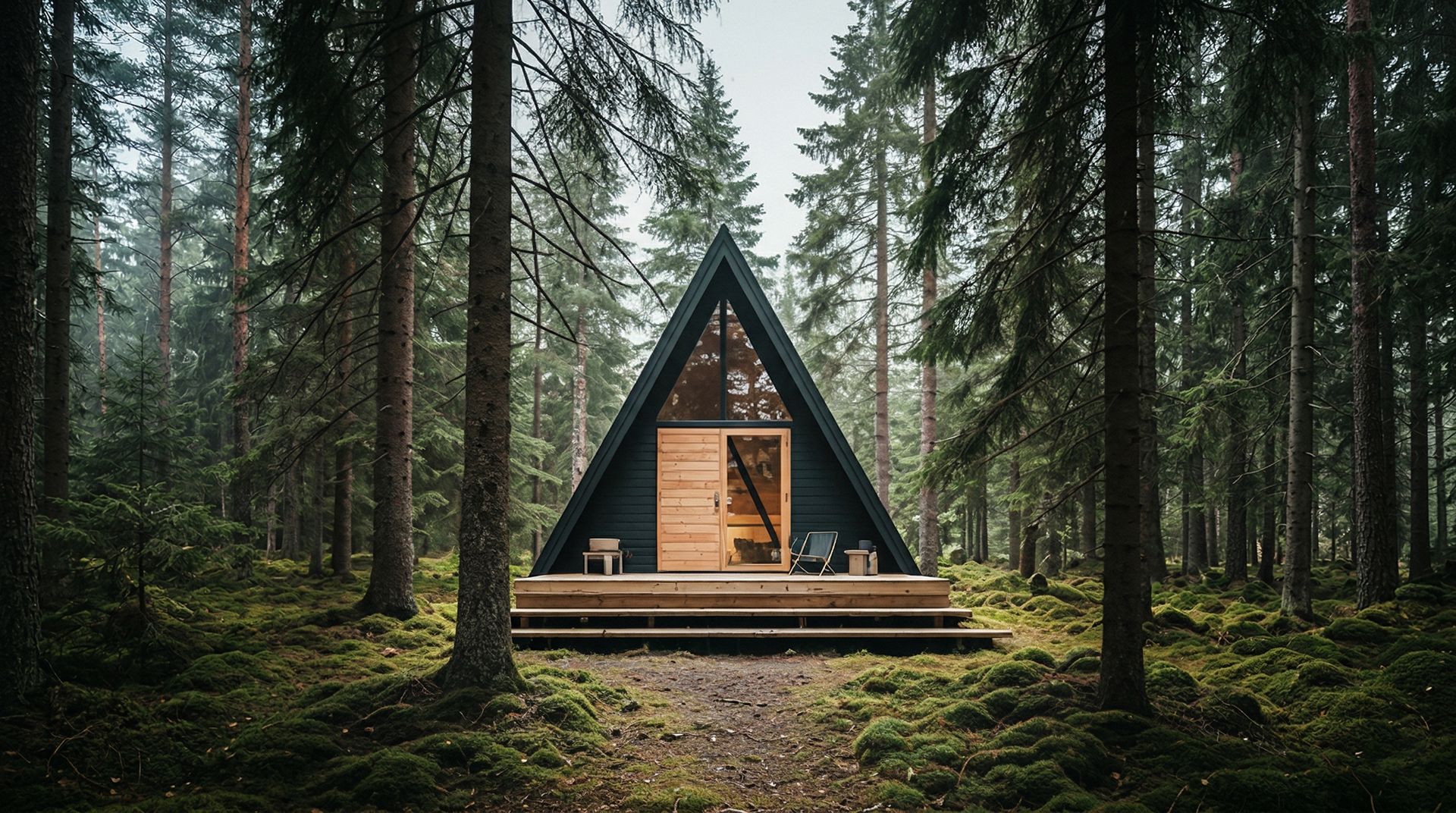 Стильные A-фрейм домики с собственной территорией. У каждого дома — огороженный дворик с выходом в лес.
